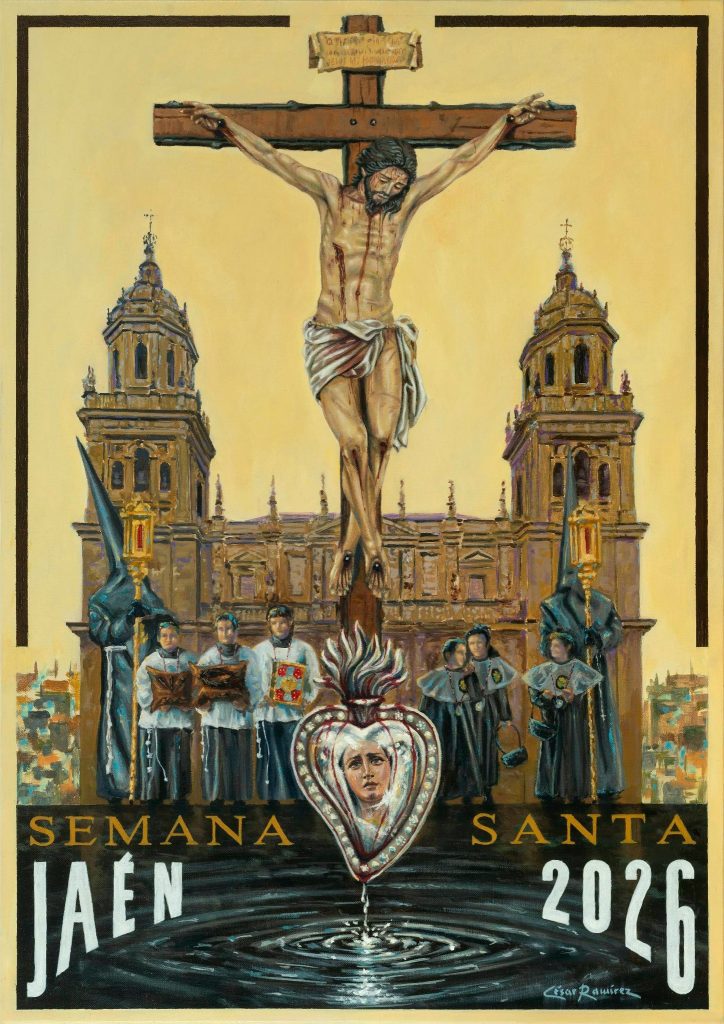 La obra, titulada “Sangre y agua, el nacimiento”, es un óleo sobre lienzo de 92 por 65 centímetros que toma como base el pasaje evangélico de San Juan en el que se relata la lanzada en el costado de Cristo, de donde brotan sangre y agua. El autor concibe el cartel como un relato simbólico …