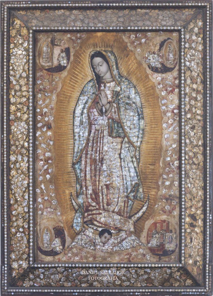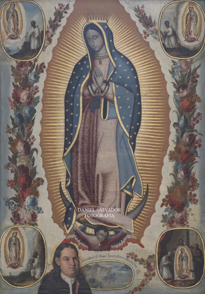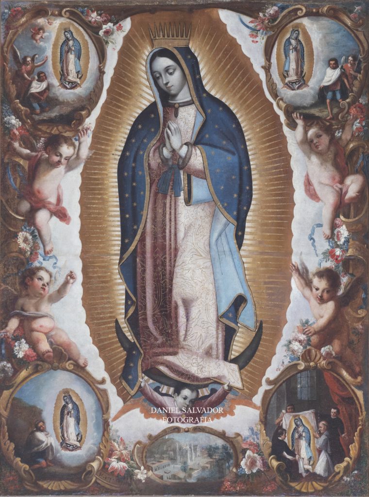 Virgen de Guadalupe con las cuatro apariciones. 1740. Atribuido a Jose de Ibarra. Óleo sobre lienzo 200×155 cm. El Puerto de Santa Maria (Cádiz). Basílica de Nuestra Señora de lo Milagros.