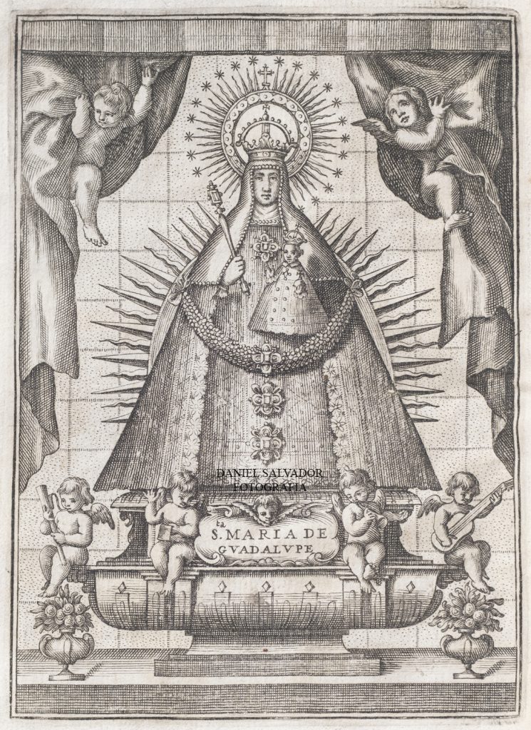 “Virgen de Guadalupe de Extremadura” 1700-1750 Anónimo. Aguafuerte y buril. 225×170 mm En Gabriel de Talavera, “Historia de Nuestra Señora de Guadalupe” Vol 1. Guadalupe (Cáceres). Real Monasterio de Santa María Guadalupe.