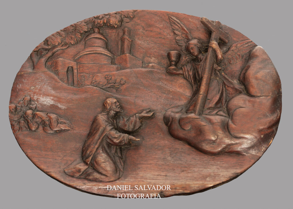 Relieve de la Oración en el Huerto. Pedro Roldán. 1686. Hermandad del Santo Entierro. Parroquia de San Bartolomé. Carmona (Sevilla) Relieve de madera en su color 19,5/20×26/26,7 cm