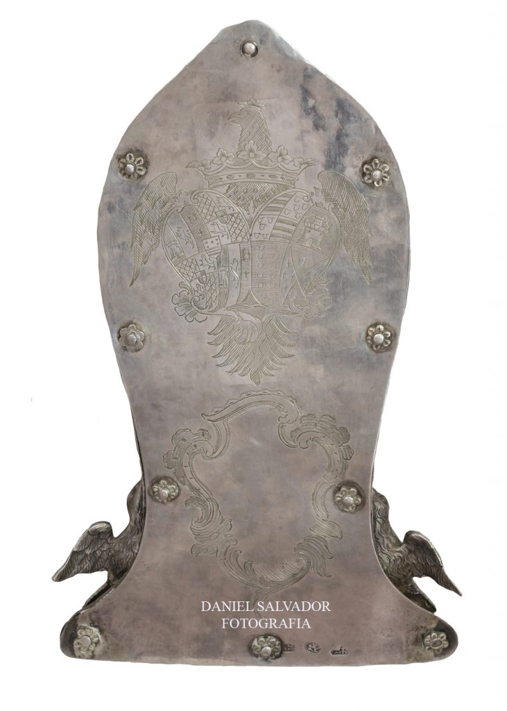 Portaviático en forma de pelícano. Damián De Castro. H. 1792. Colegiata de Santa Maria de la Asunción. Medinaceli. Soria. Plata en su color y plata dorada. Punzones: sello ovalado con león rampante a la derecha.