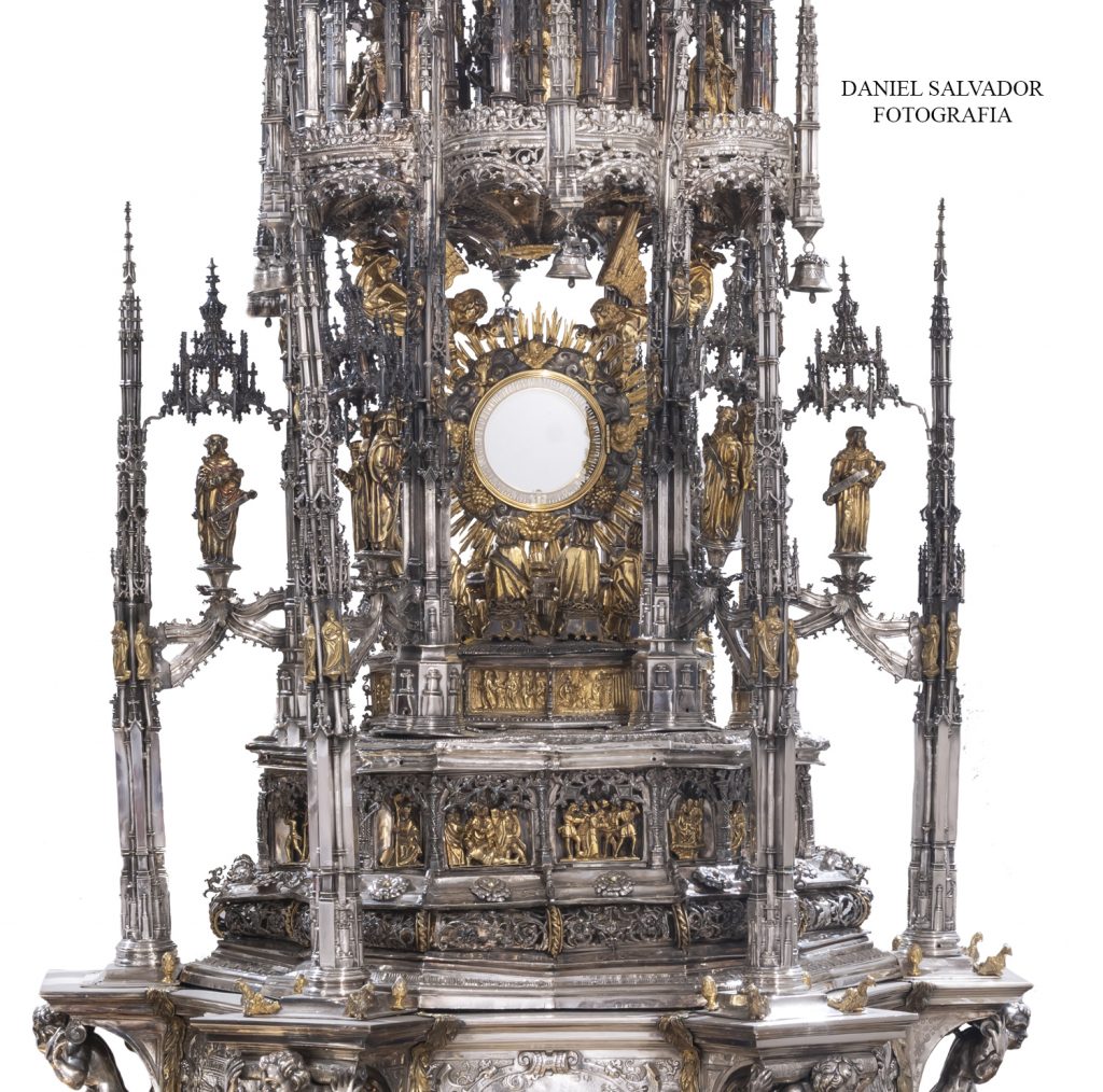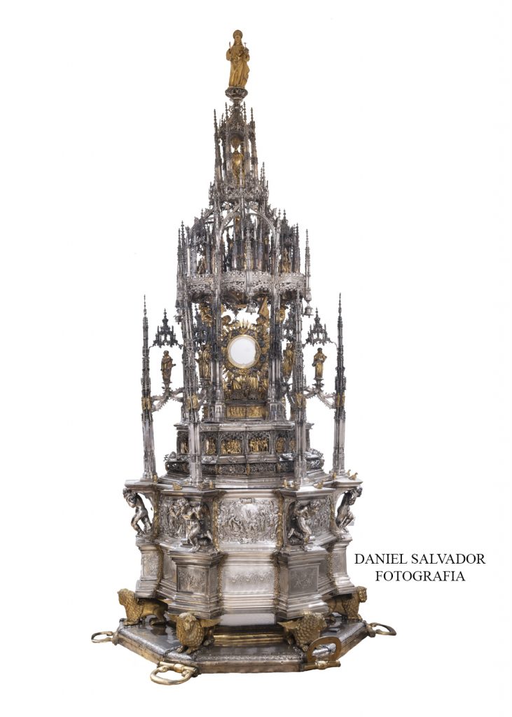 Custodia procesional. Pedro de Ávila. 1515. Museo catedralicio. Zamora. Antonio Rodríguez. Zócalo superior. 1598. Narciso Sánchez (talleres de Arte Granda). Zócalo inferior. 1800-1987. Plata en su color y sobredorada. Bronce. 210 x 86 x 86 cm.