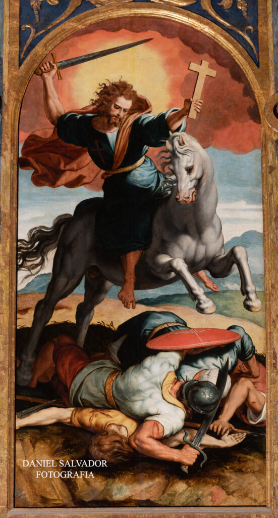 Santiago en la batalla de Clavijo. Retablo de la Purificación de la Virgen. Pedro de Campaña. 1.555. Capilla del Mariscal. Catedral de Sevilla