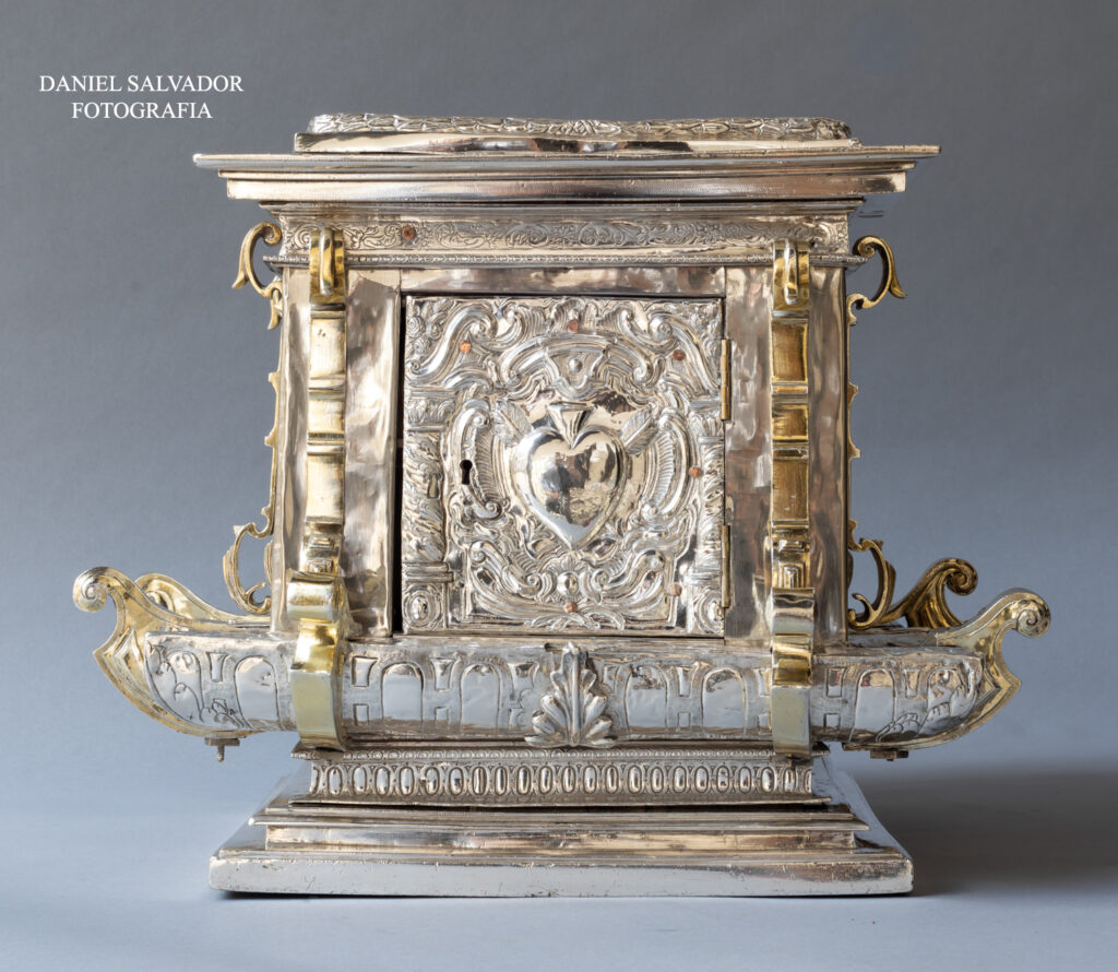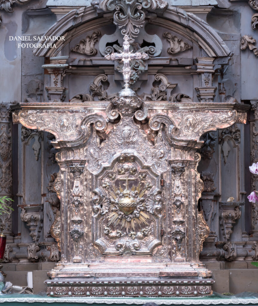 Sagrario. Anónimo. 1760. Plata repujada. Monasterio de San Leandro de Sevilla. “Ha honra y gloria de Jesús Sacramentado, de su Santísimo Corazón, lo costeó la Señora Doña Isabel de Espinosa y Maldonado. Año de 1760”