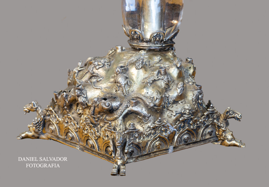 Detalle de cruz de altar. Obrador novohispano. h 1560. Plata fundida, repujada, cincelada, calada y dorada y cristal de roca. 48x23x14,5 cm. Catedral de san Antolín (Palencia)