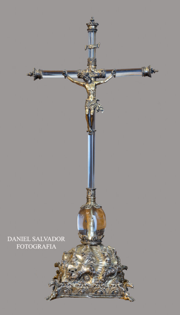 Cruz de altar. Obrador novohispano. h 1560. Plata fundida, repujada, cincelada, calada y dorada y cristal de roca. 48x23x14,5 cm. Catedral de san Antolín (Palencia)