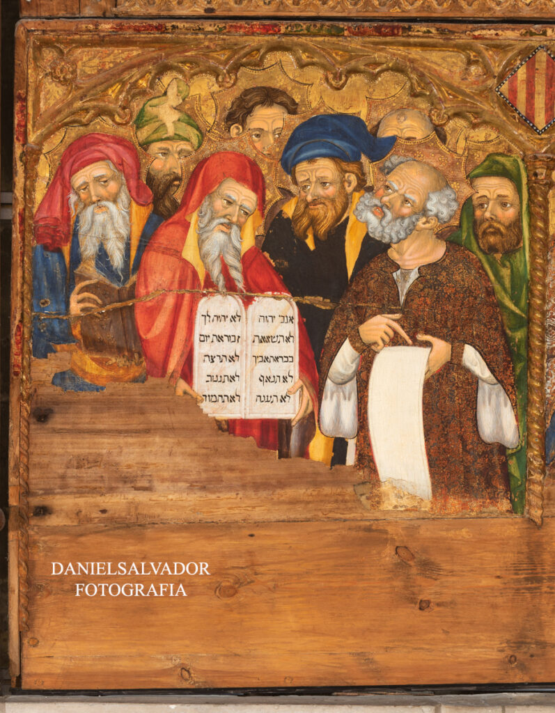Moisés con las Tablas de la Ley (1411) Guerau Generosa y Lluís Borrassá. Temple y pan de oro sobre tabla. 106×72 cm. (detalle de la rédela del retablo Del Real Monasterio de Santa María de Santes Creus) Tarragona, Catedral de Santa Tecla. Capilla de la Virgen de Montserrat