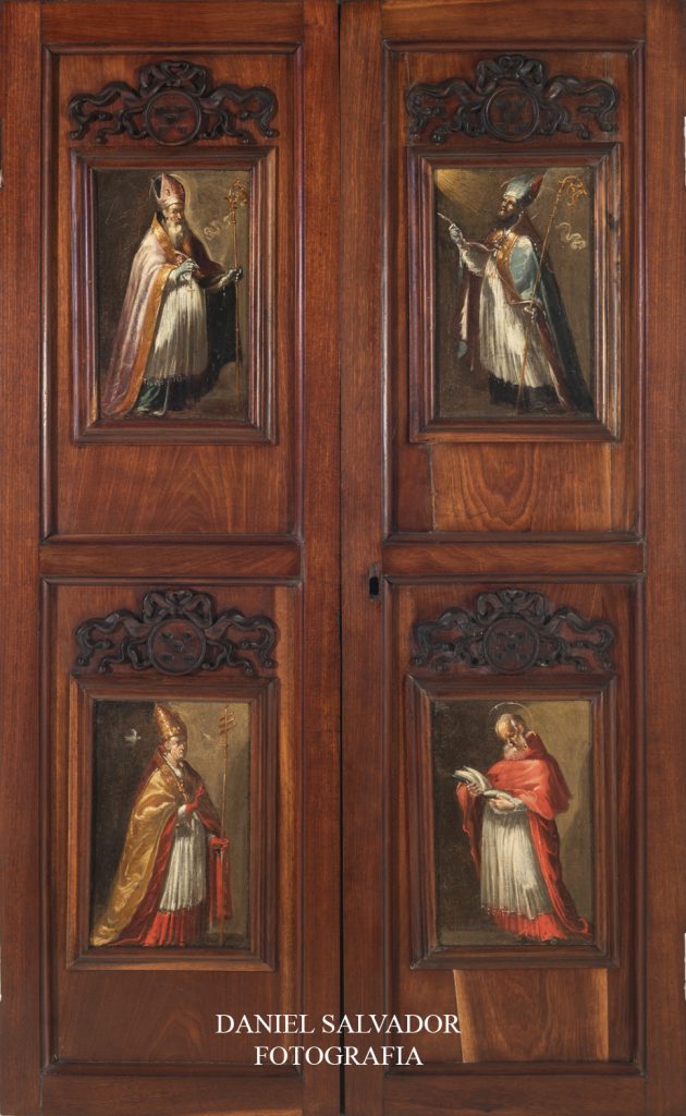Los padres de la Iglesia latina. San Ambrosio, San Agustín, San Gregorio y San Jerónimo Puertas del manifestador eucarístico. anónimo sevillano tercer cuarto s. XVII. Origen: Hospital de las Cinco Llagas. Diputación de Sevilla
